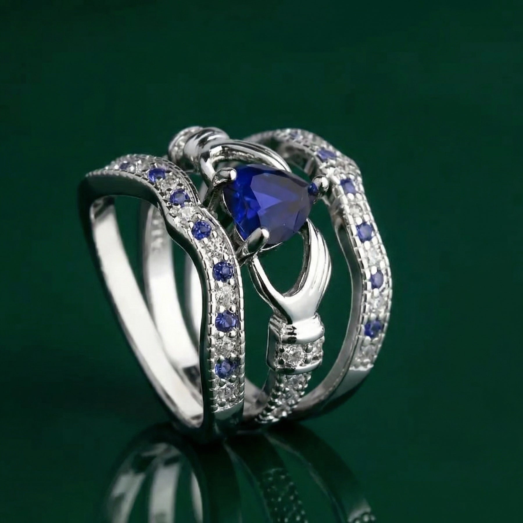 Heart of Azure: The center ring showcases a vibrant, trillion-cut blue gemstone held in a distinctive claw setting, representing a love that is both deep and steadfast.
