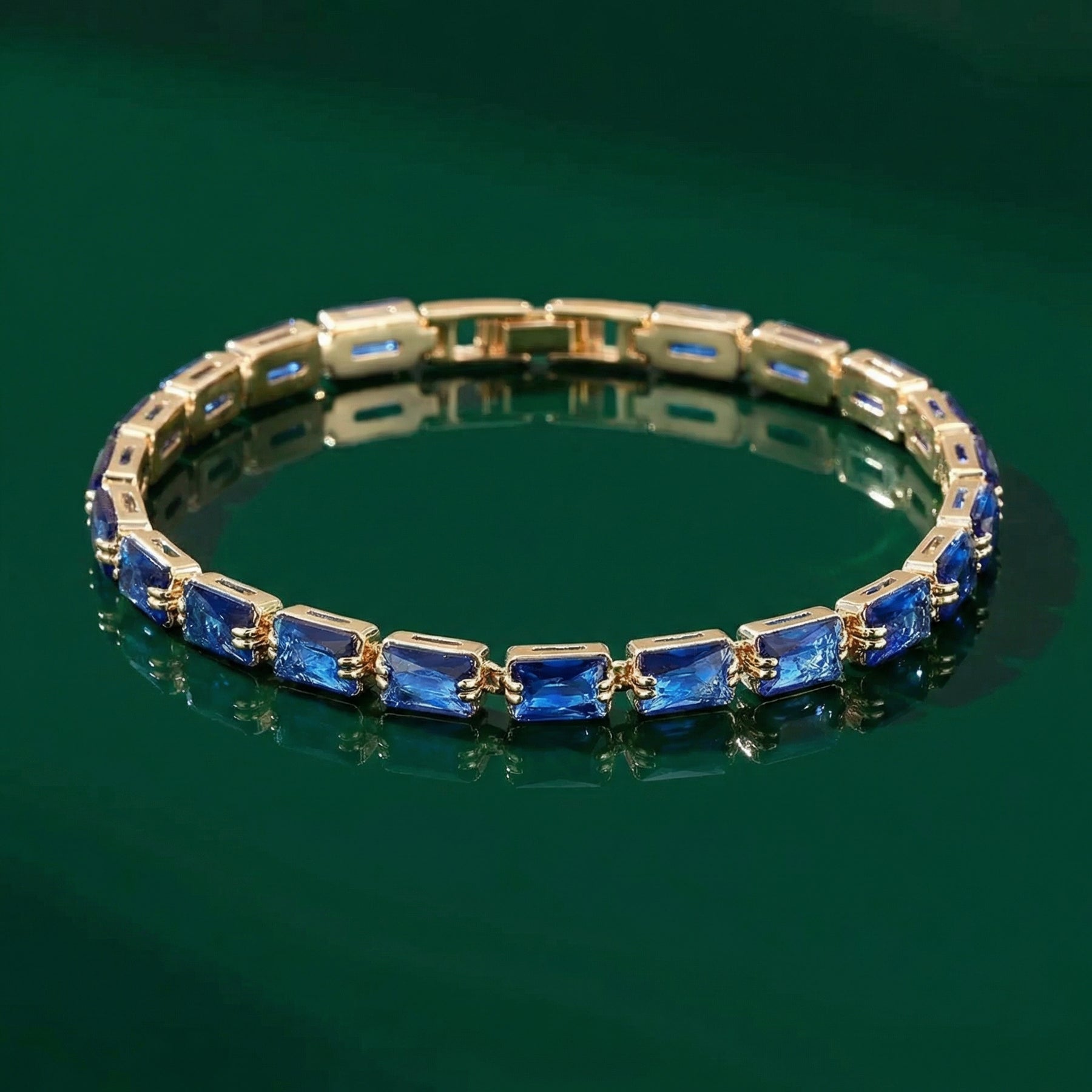 Midnight Azure Brilliance: The bracelet is meticulously set with a sequence of rectangular stones in a deep royal blue, offering a rich color profile that evokes the mystery of the evening sky.