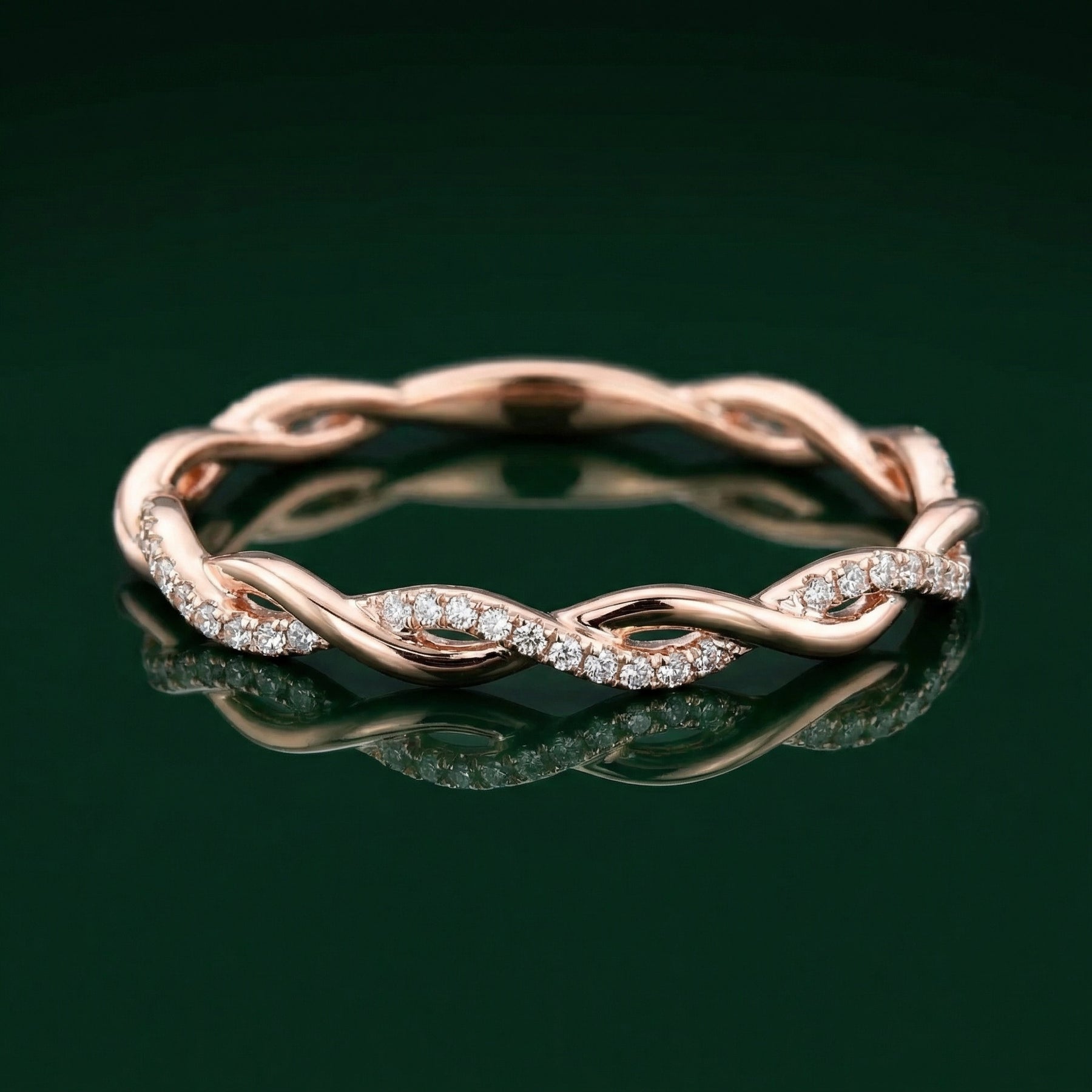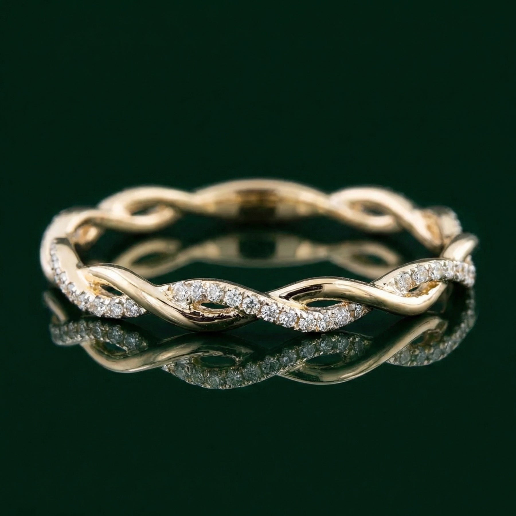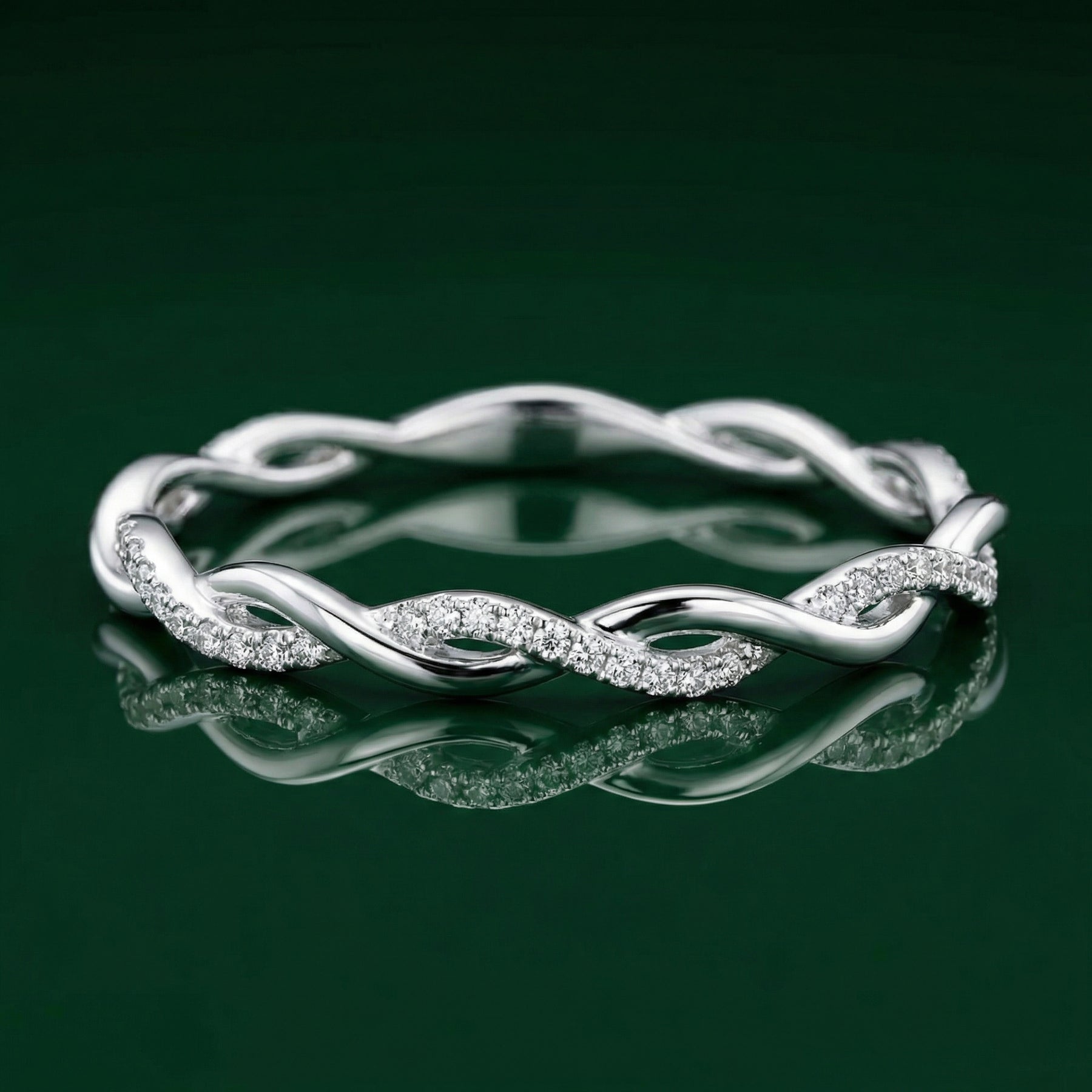 Delicate Crystal Accents: One strand of the twist is meticulously handset with pavé crystals that provide a soft, romantic sparkle. These stones are carefully chosen to ensure a high-clarity shimmer that elevates the ring from a simple band to a luxury statement.
