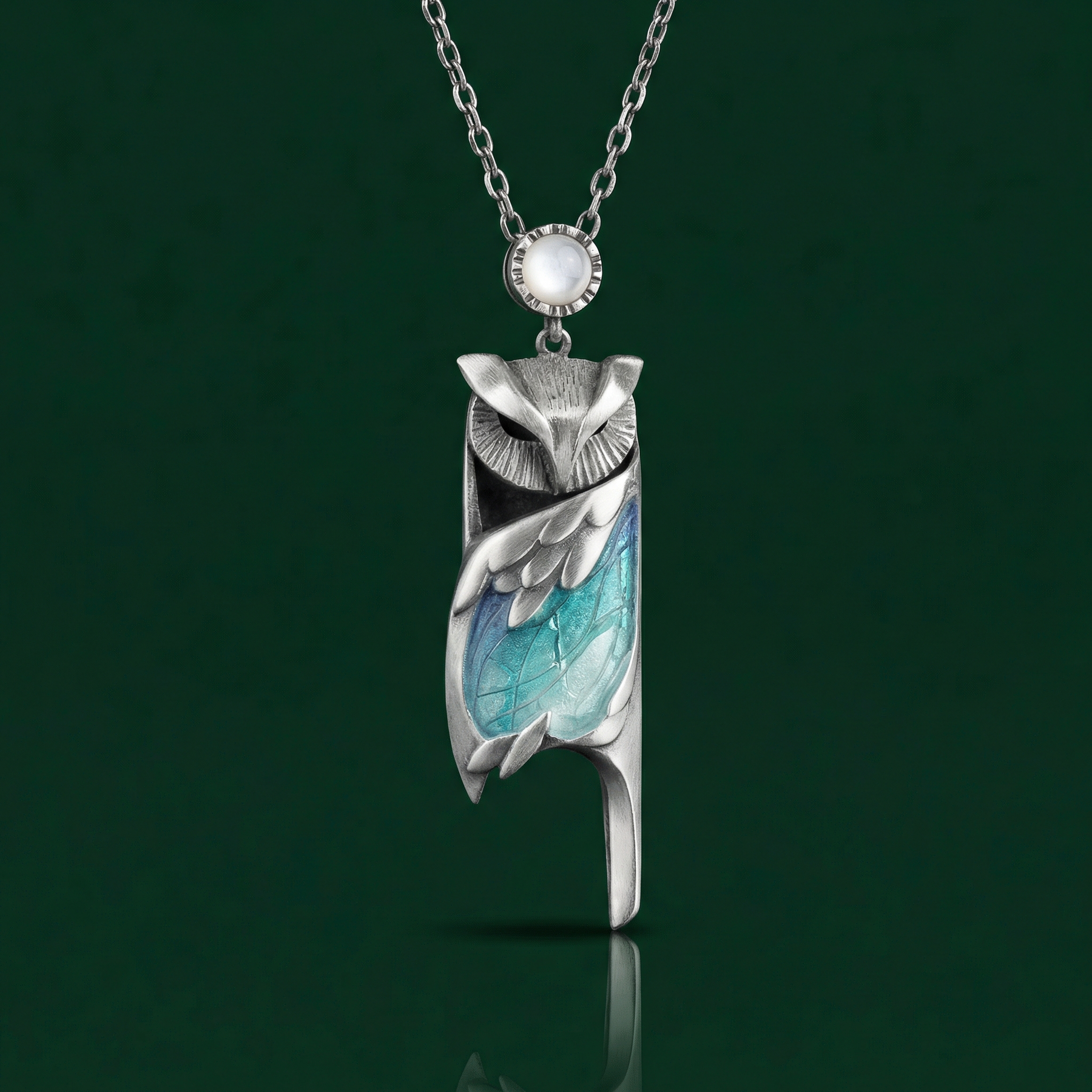 Ethereal Moonstone Accent: Suspended gracefully above the owl is a milky, translucent stone that mimics the soft glow of the moon, adding a layer of symbolism and elegance to the overall composition.